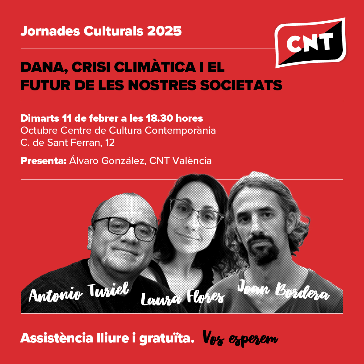 Des de CNT València hem impulsat unes Jornades Culturals Extraordinàries per a iniciar 2025. Com sempre, la nostra intenció és generar un espai per a abordar diferents qüestions que ens travessen com a societat des de l’intercanvi de coneixement i la reflexió. En aquesta ocasió, hem considerat oportú dedicar-les a la DANA, analitzant la gestió i el seu context climàtic-social.